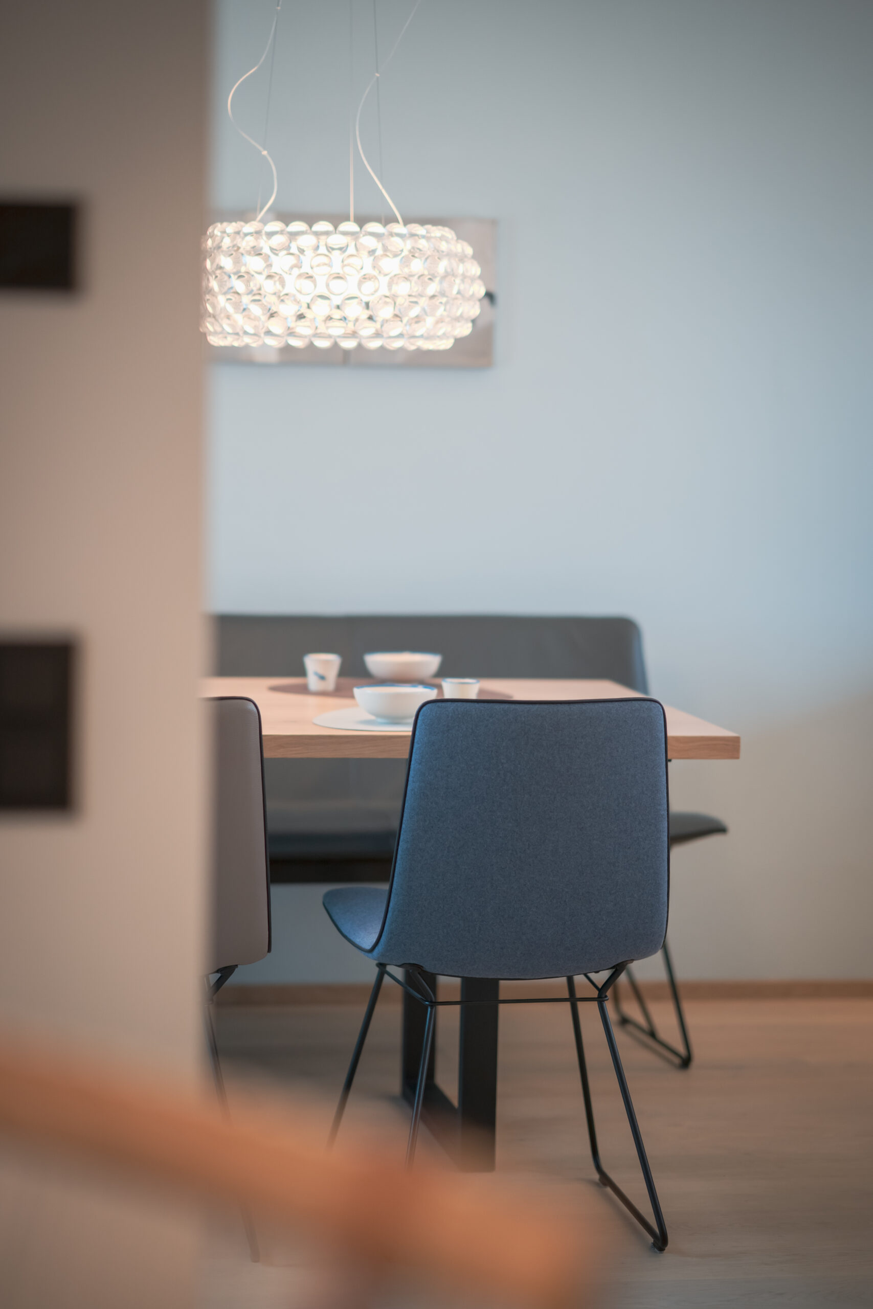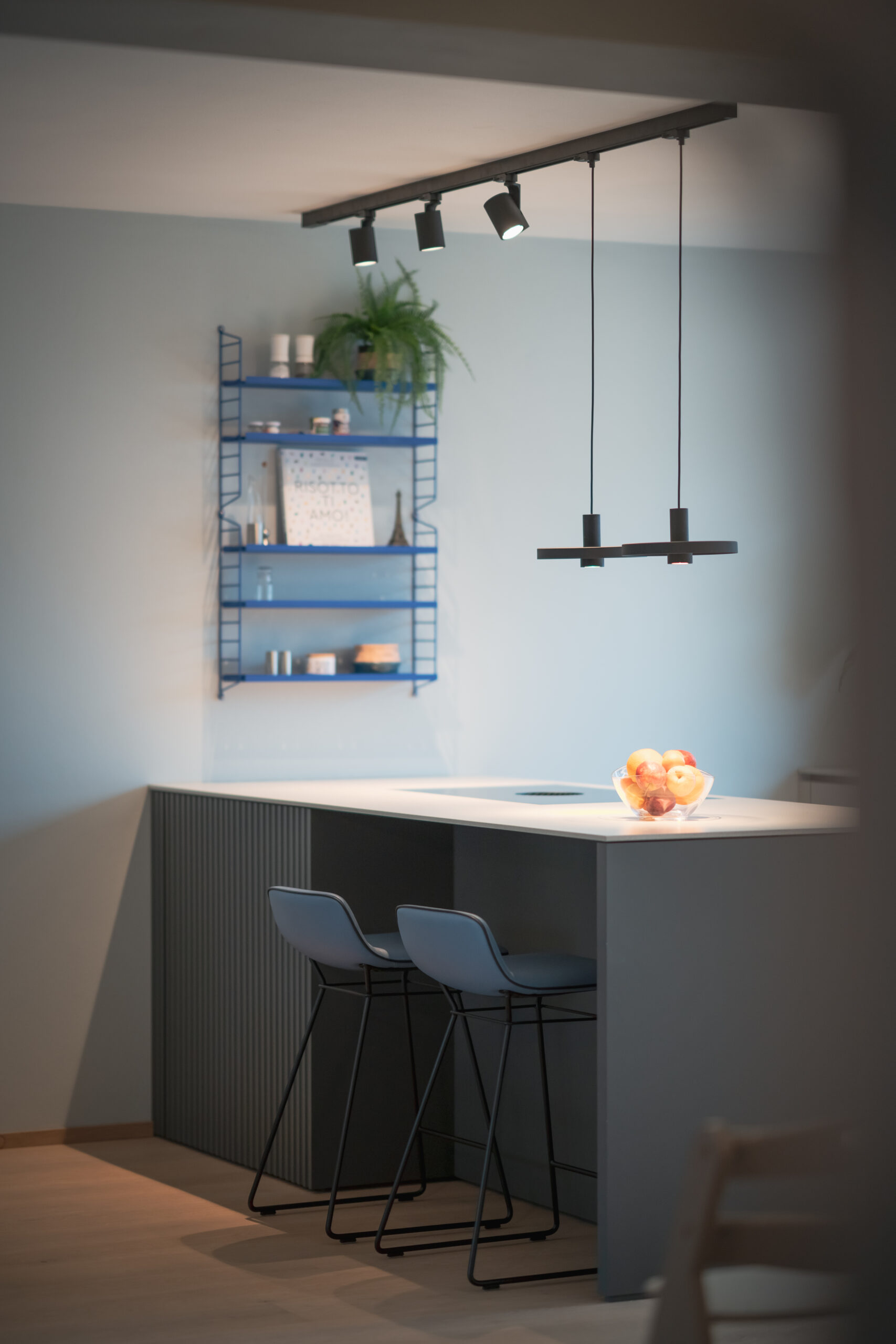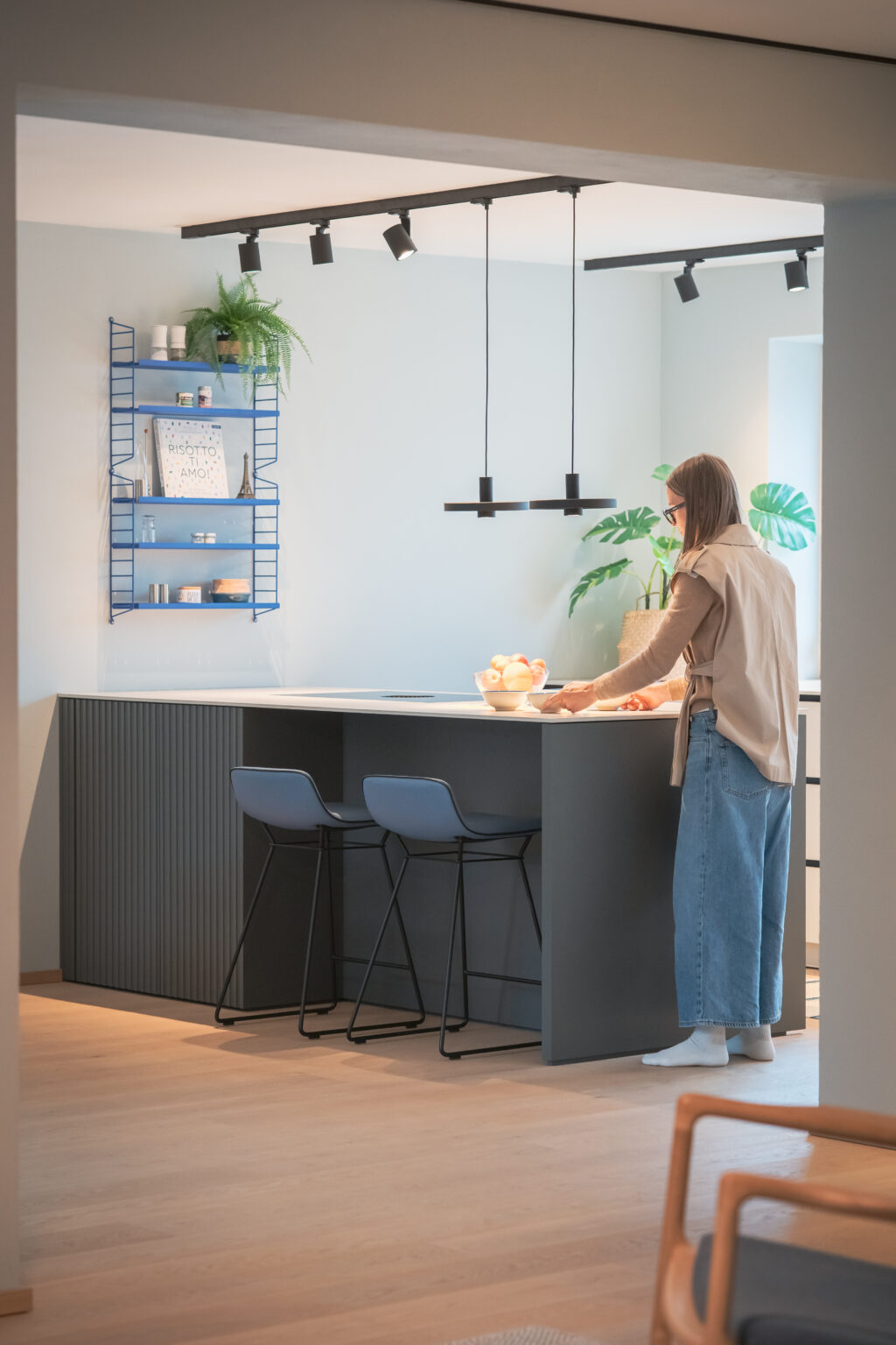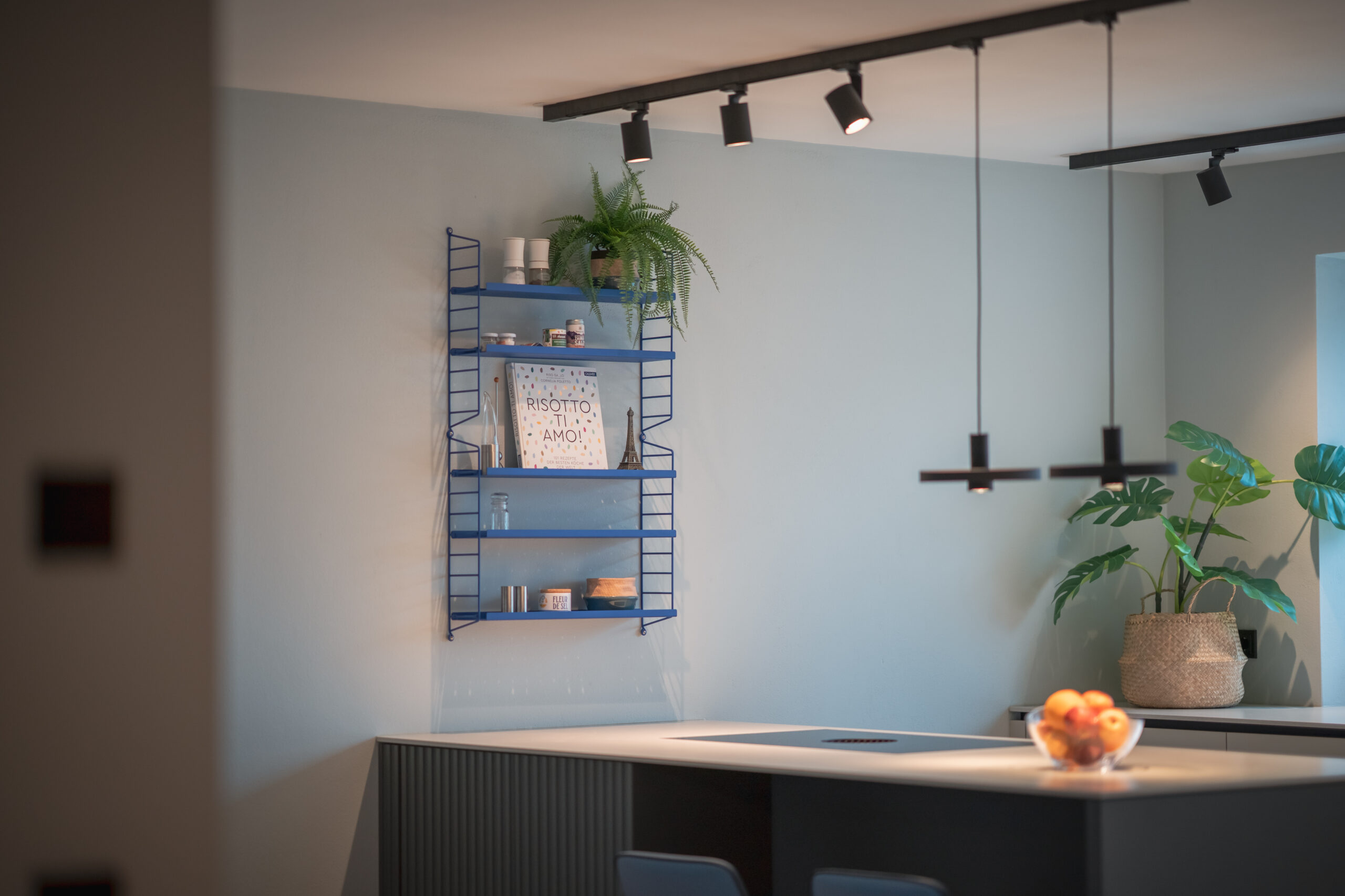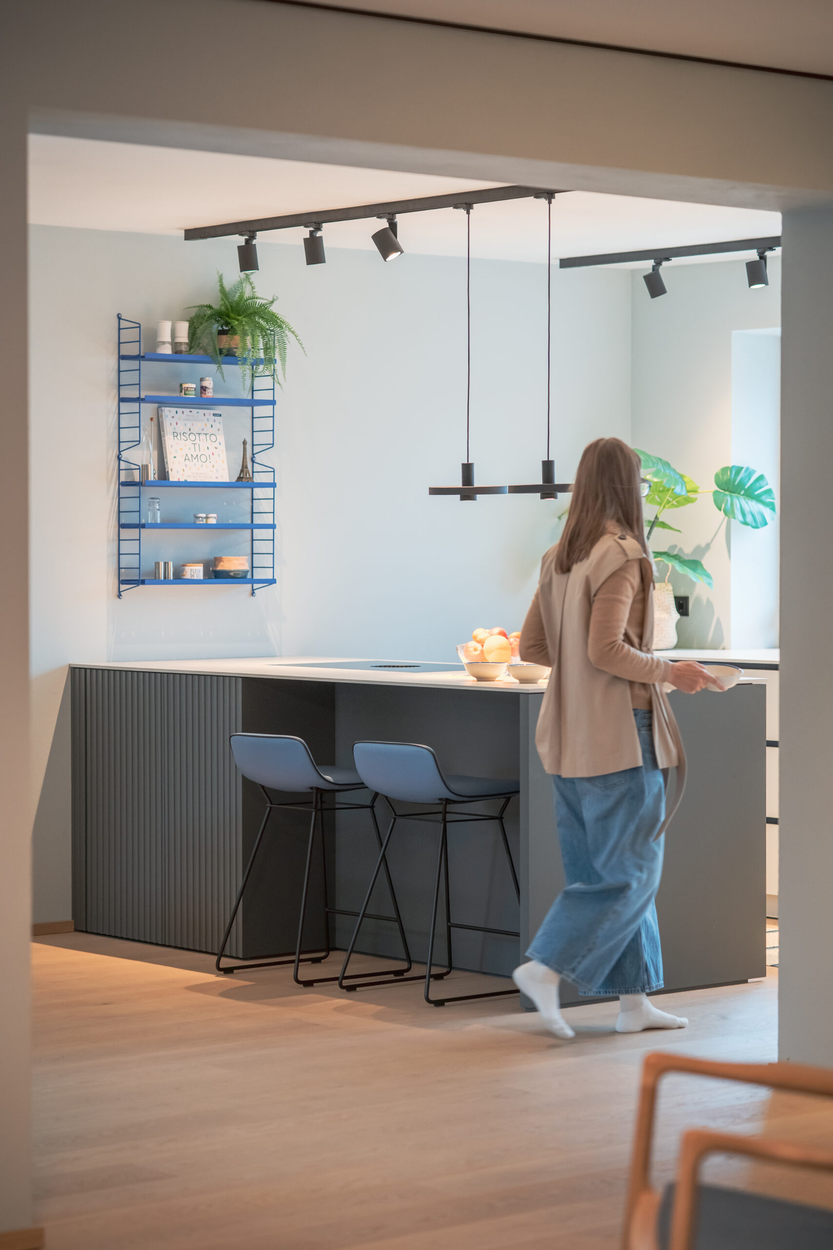 Die Wohnküche bildet das Herz des Hauses. Nuancierte Blautöne, matte Fronten und eine klare Formensprache erzeugen Ruhe und Leichtigkeit. Dezente Akzente – wie das blitzblaue Pocket-Regal und frisches Pflanzengrün – setzen lebendige Kontrapunkte. Der Essbereich öffnet sich großzügig zum Garten und wird vom sanften Tageslicht getragen. Warme Stoffe, leichte Stühle und eine skulpturale Pendelleuchte schaffen eine einladende Atmosphäre für gemeinsame Momente. Der Raum wirkt reduziert und zugleich wohnlich – ein Ort, an dem man gerne verweilt.