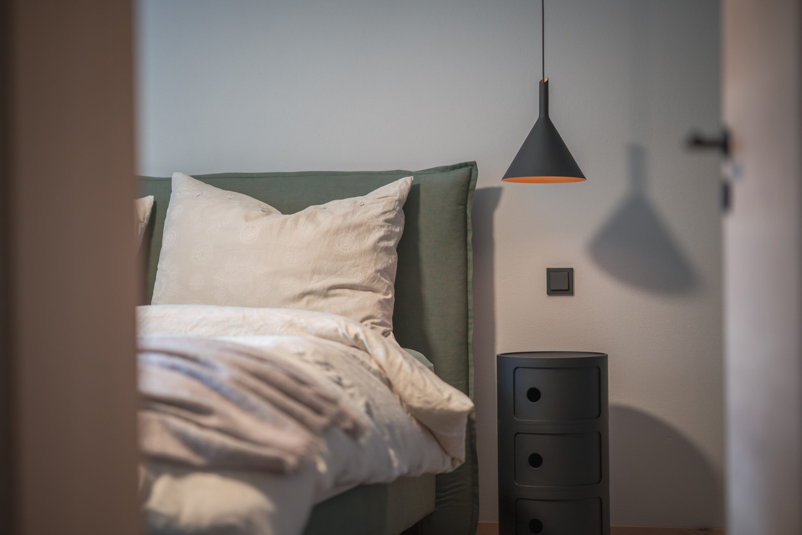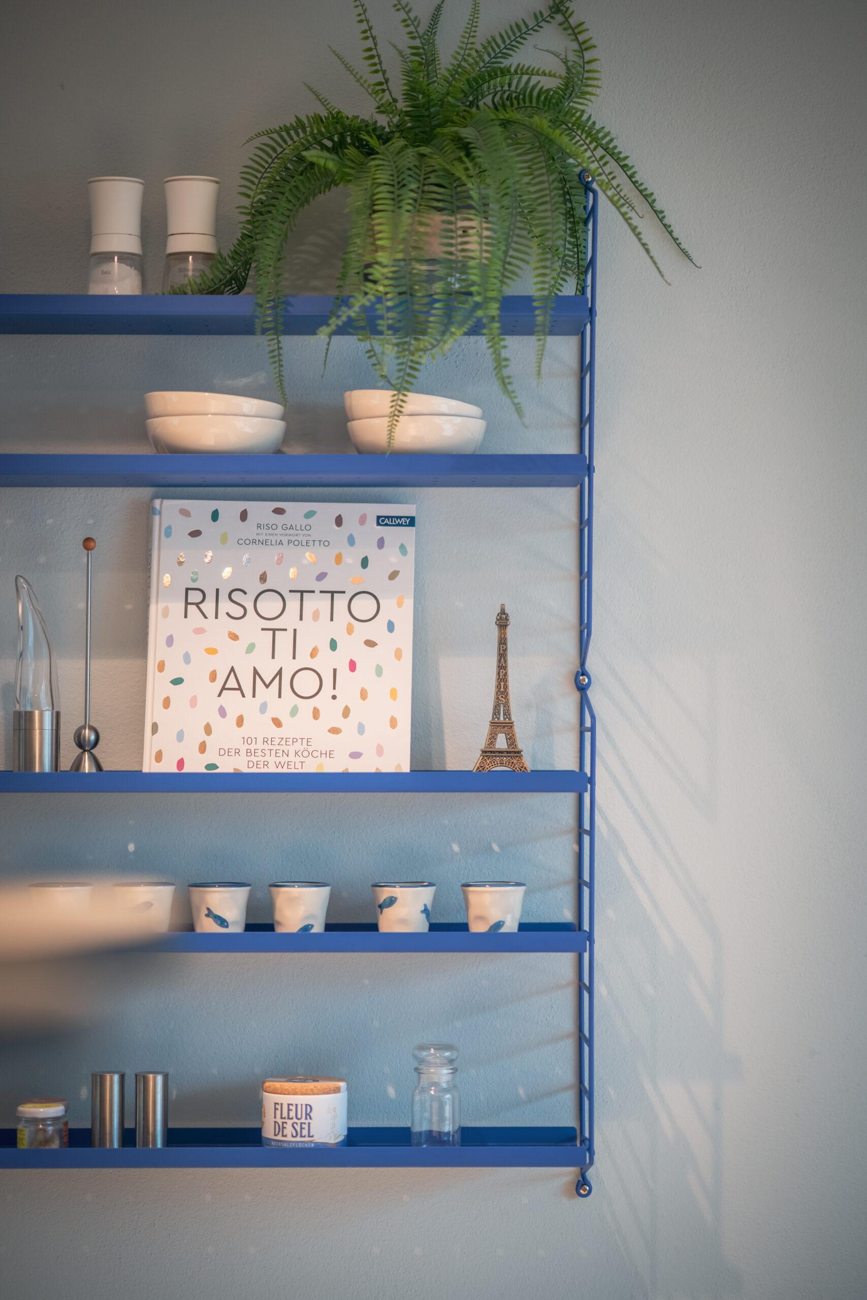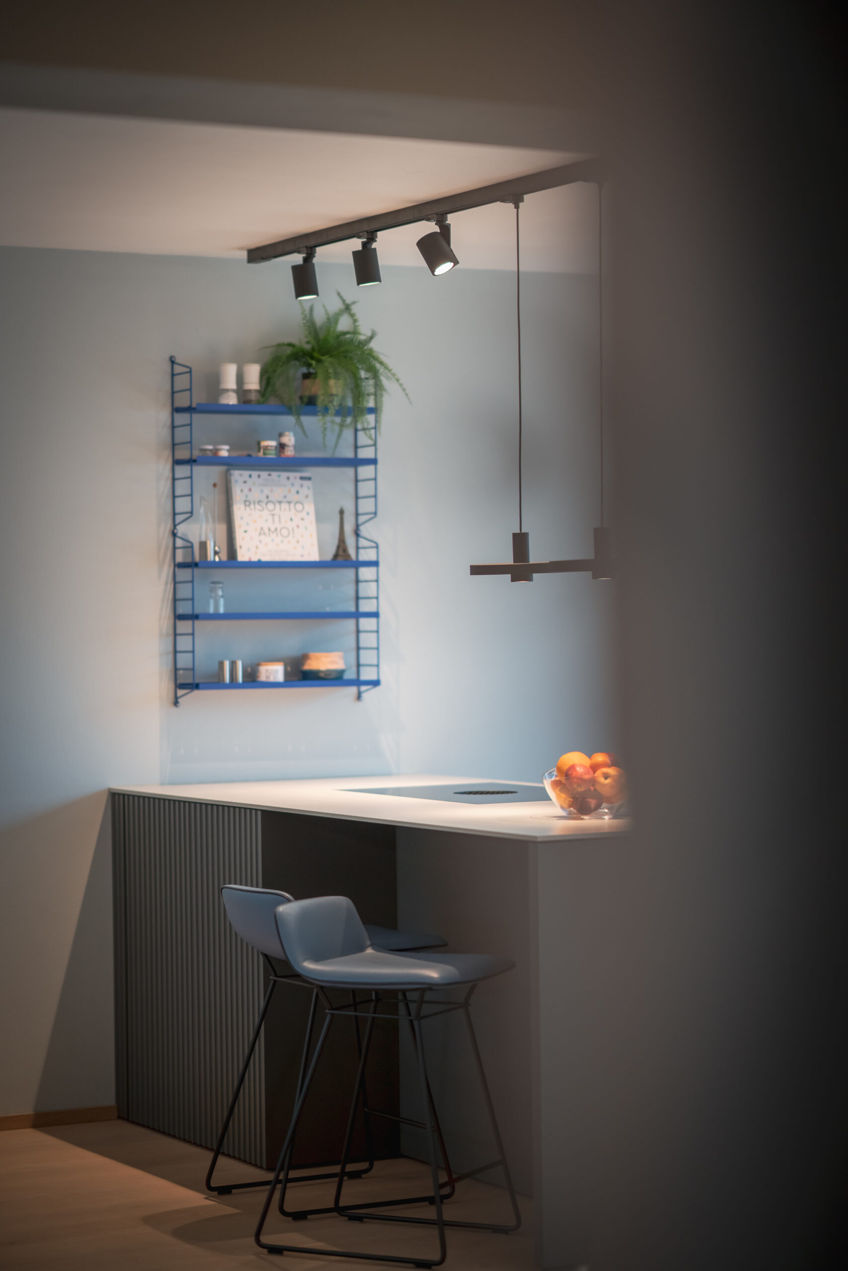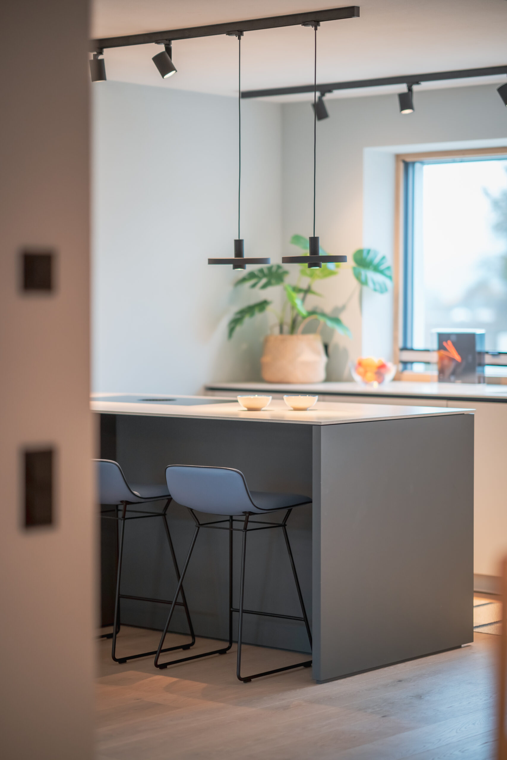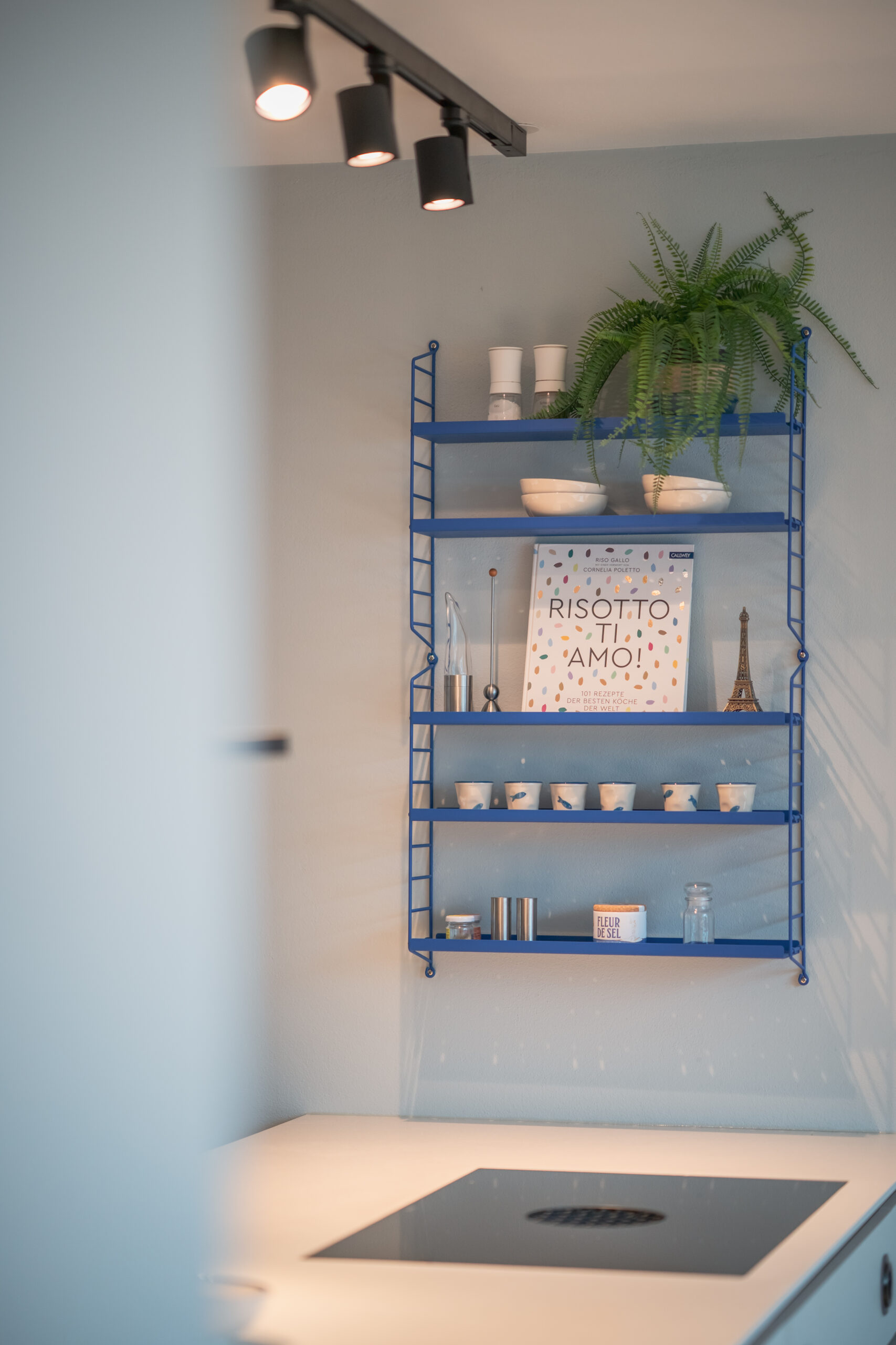Die Wohnküche bildet das Herz des Hauses. Nuancierte Blautöne, matte Fronten und eine klare Formensprache erzeugen Ruhe und Leichtigkeit. Dezente Akzente – wie das blitzblaue Pocket-Regal und frisches Pflanzengrün – setzen lebendige Kontrapunkte. Der Essbereich öffnet sich großzügig zum Garten und wird vom sanften Tageslicht getragen. Warme Stoffe, leichte Stühle und eine skulpturale Pendelleuchte schaffen eine einladende Atmosphäre für gemeinsame Momente. Der Raum wirkt reduziert und zugleich wohnlich – ein Ort, an dem man gerne verweilt.