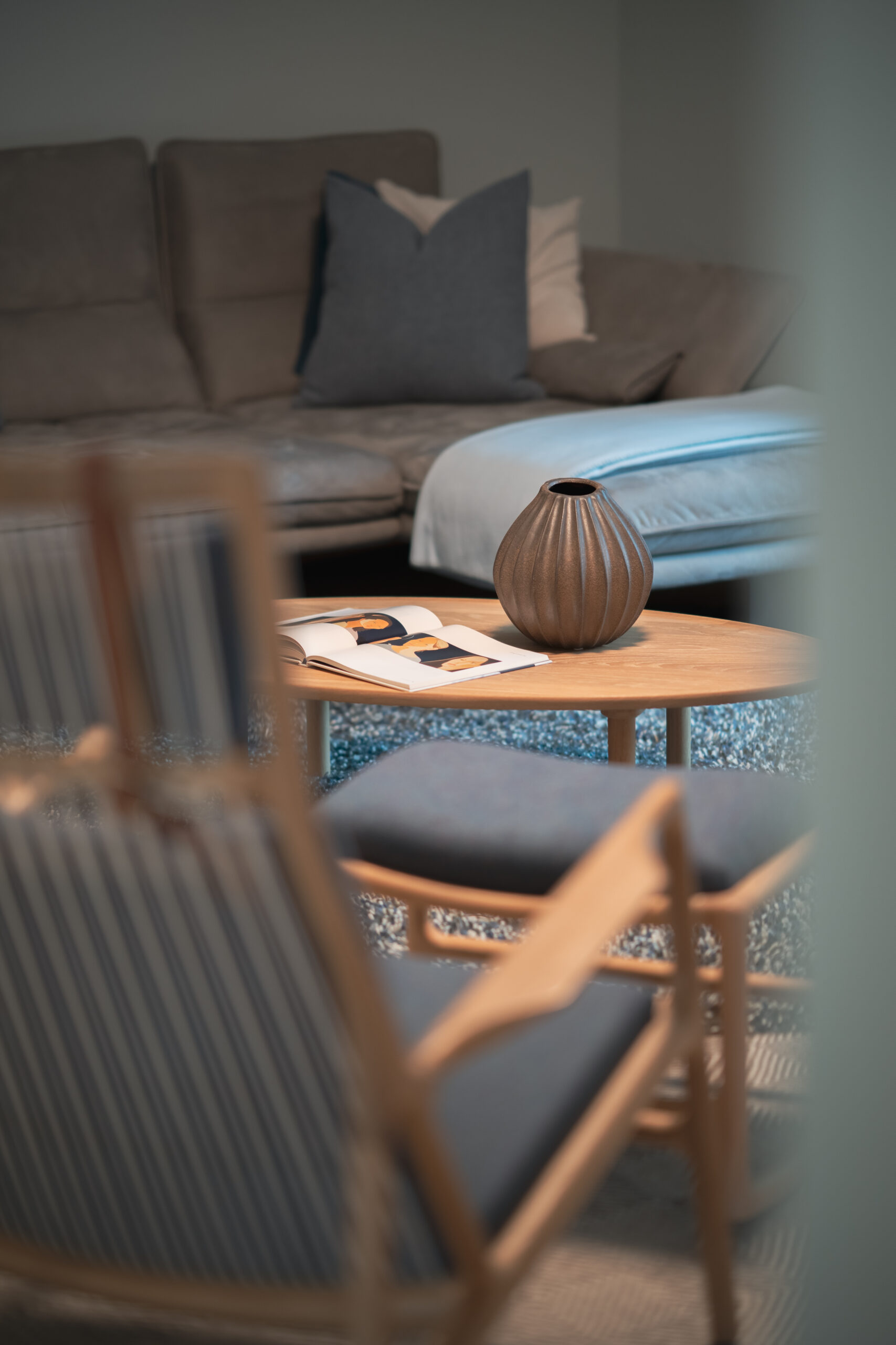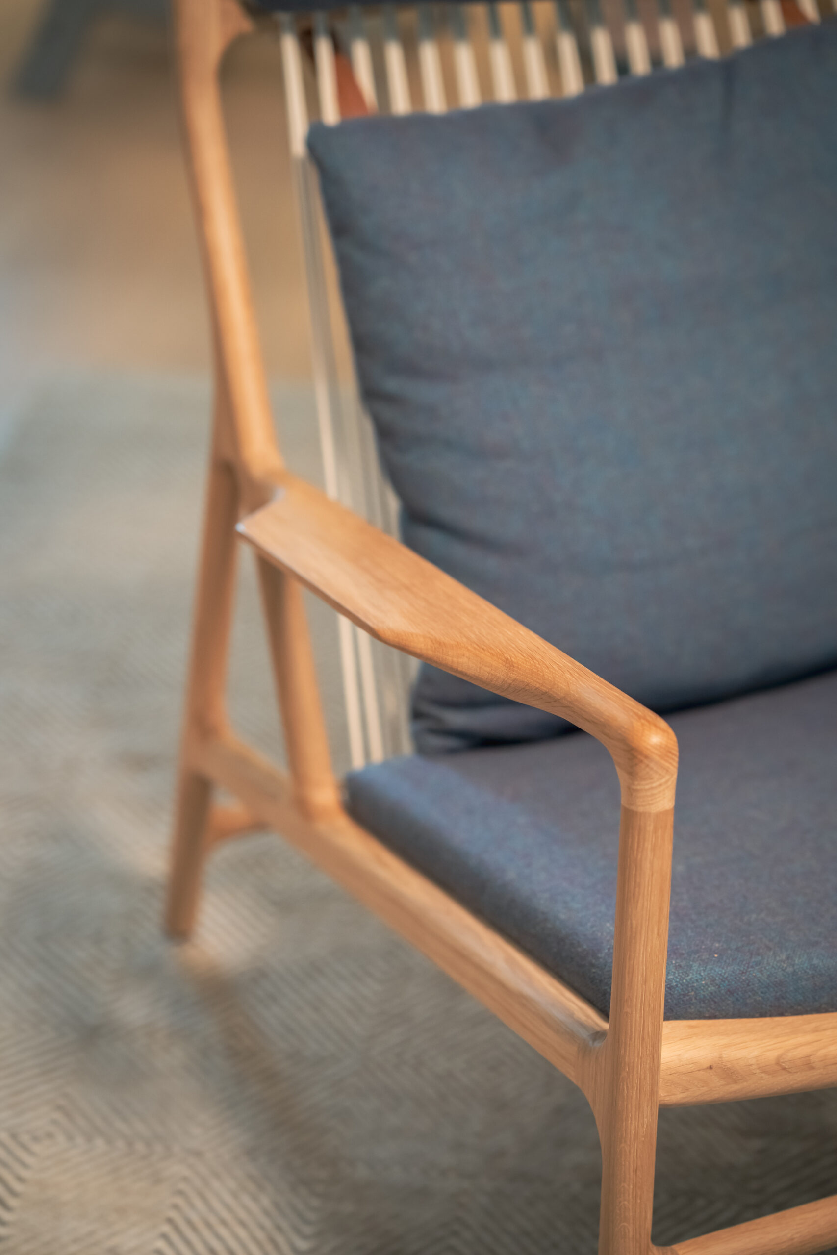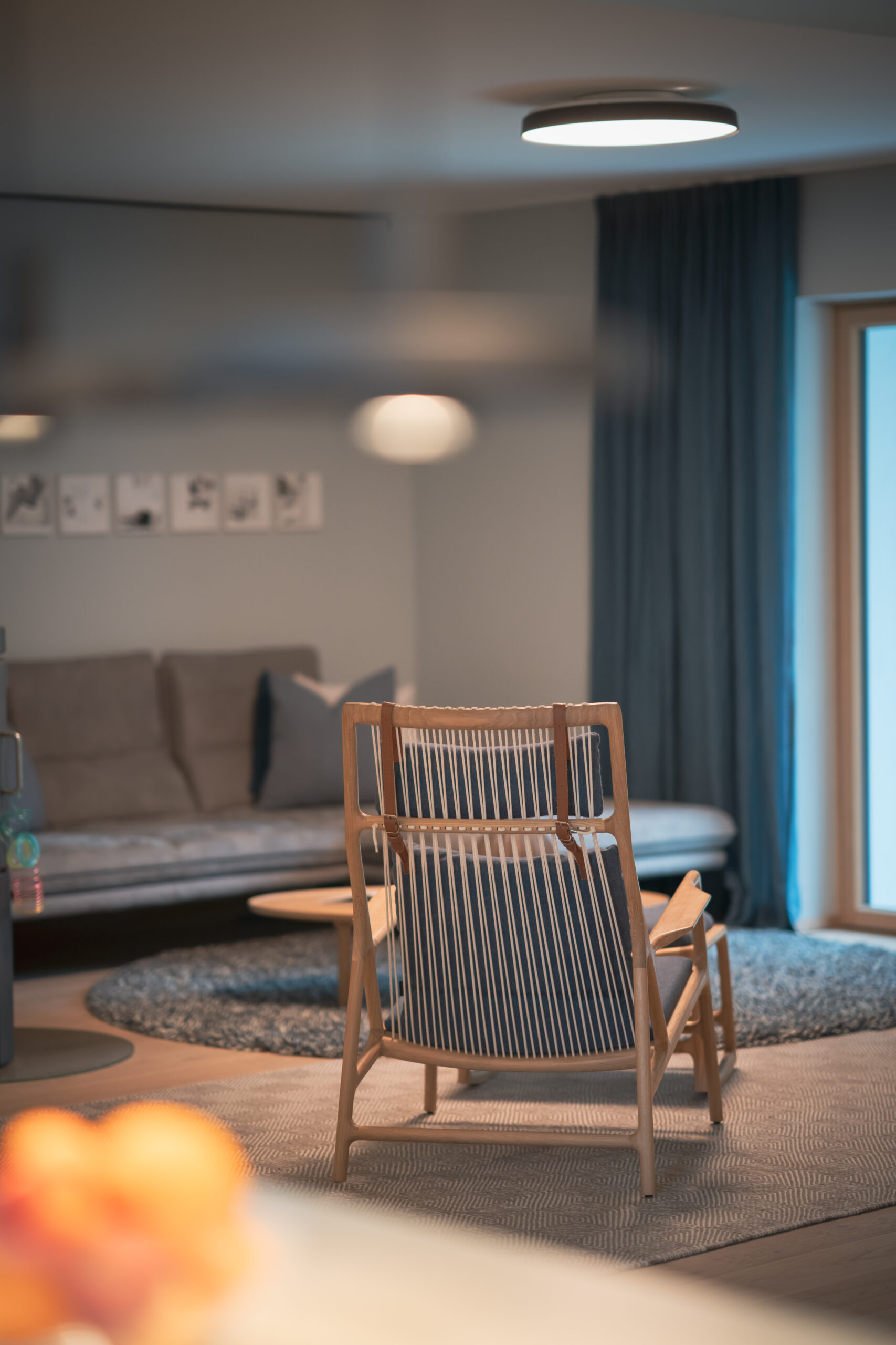 Im angrenzenden Wohnbereich dominieren weiche Texturen, ruhige Farben und natürliche Materialien wie weiß geölte Eiche. Großzügige Fensterflächen lassen den Raum weitläufig erscheinen, eingerahmt von fließenden Leinenvorhängen in sattem Jeansblau.