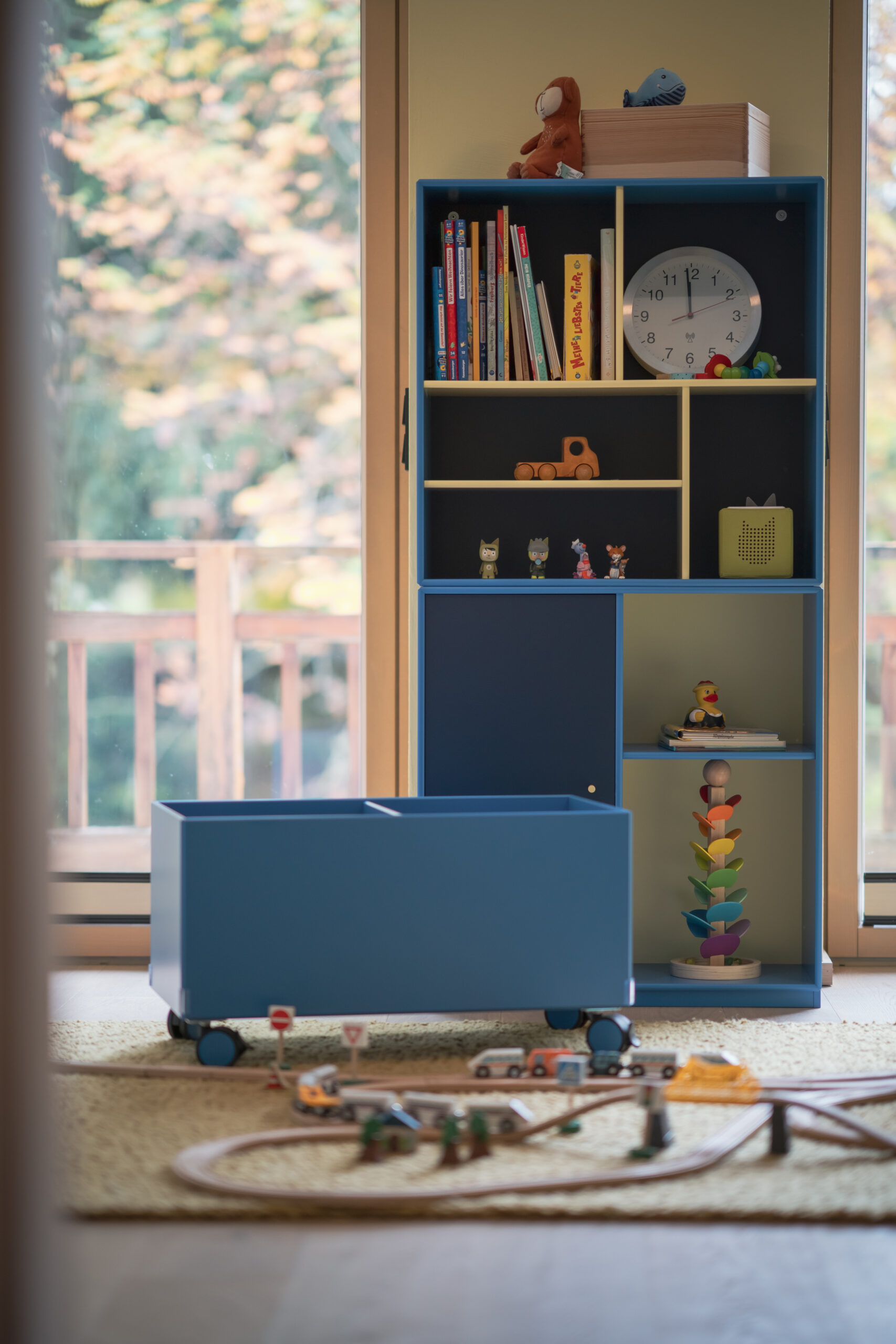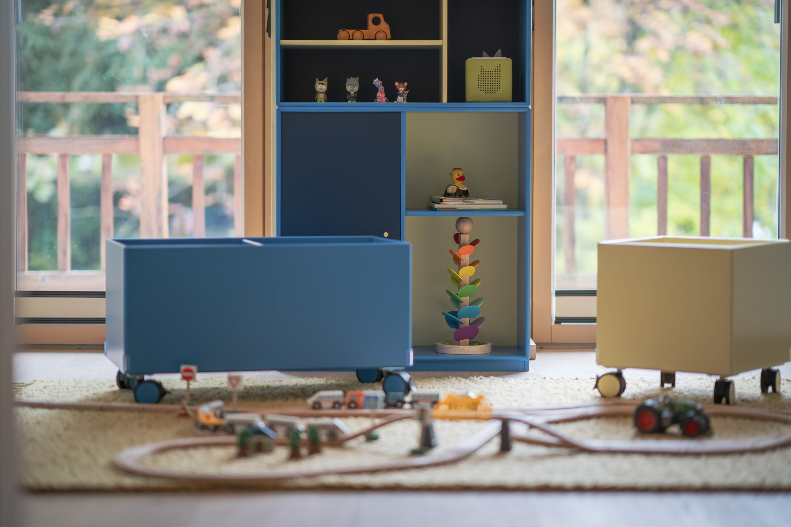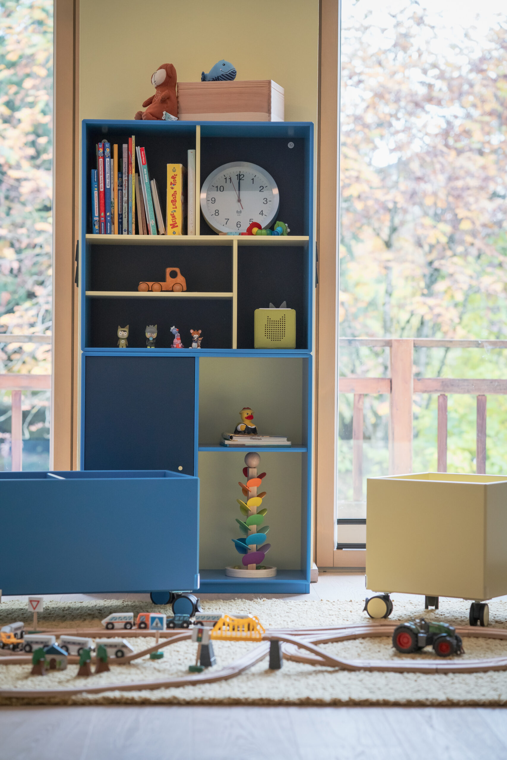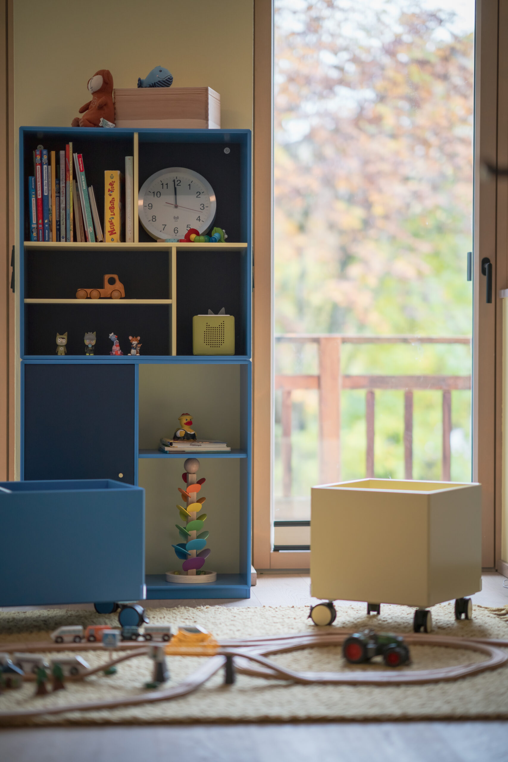 Das lichtdurchflutete Stiegenhaus aus heller Eiche führt in die Schlaf- und Kinderzimmer. Dort bringt das Kinderzimmer Farbe und Leichtigkeit ins Haus. Ein maßgeschneidertes Regalsystem von Montana in Blau- und zitronigen Gelbtönen schafft Ordnung und bietet Platz für Bücher, Spiele und besondere Fundstücke. Der Raum bleibt verspielt und dennoch strukturiert – ein Ort, der mitwächst.