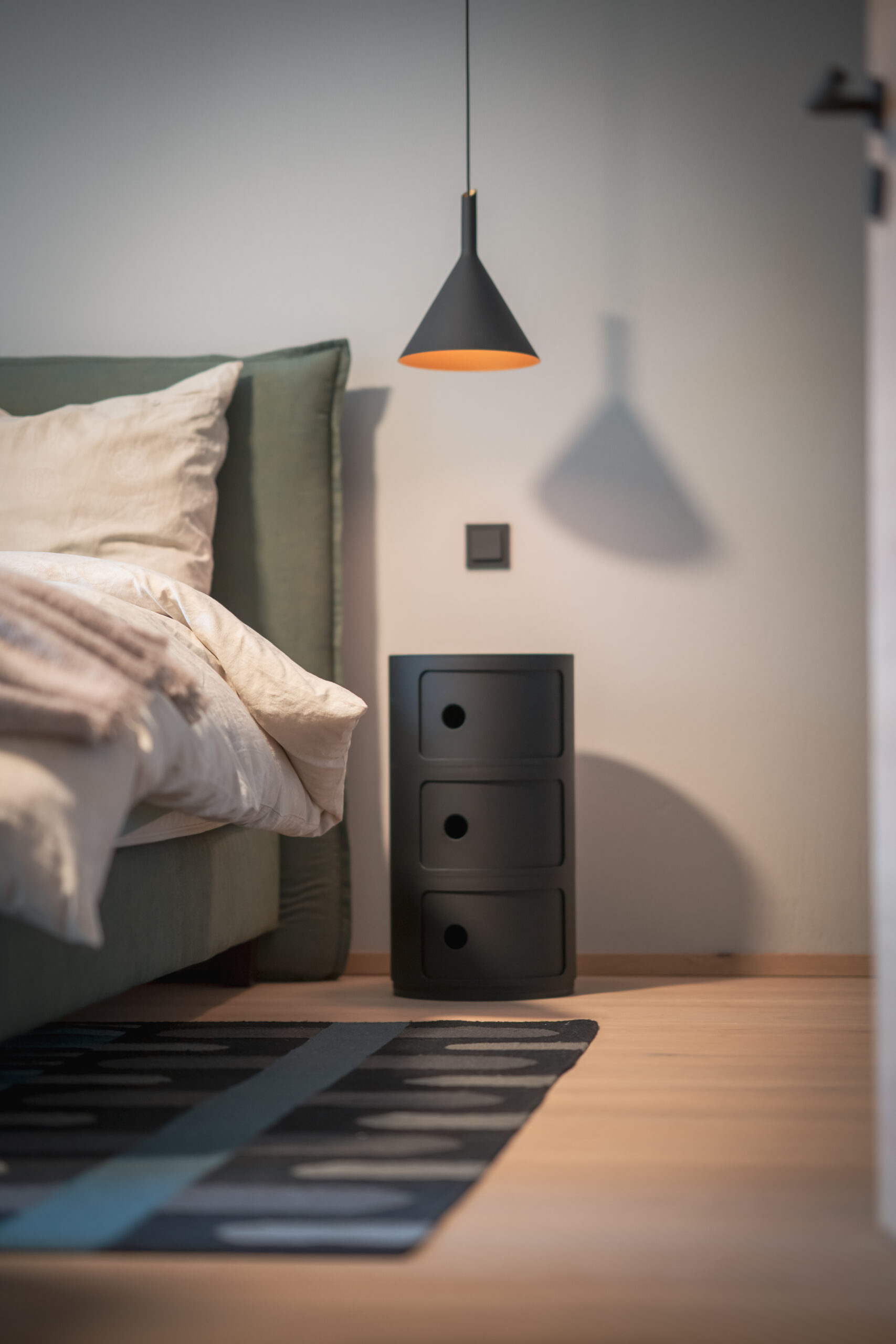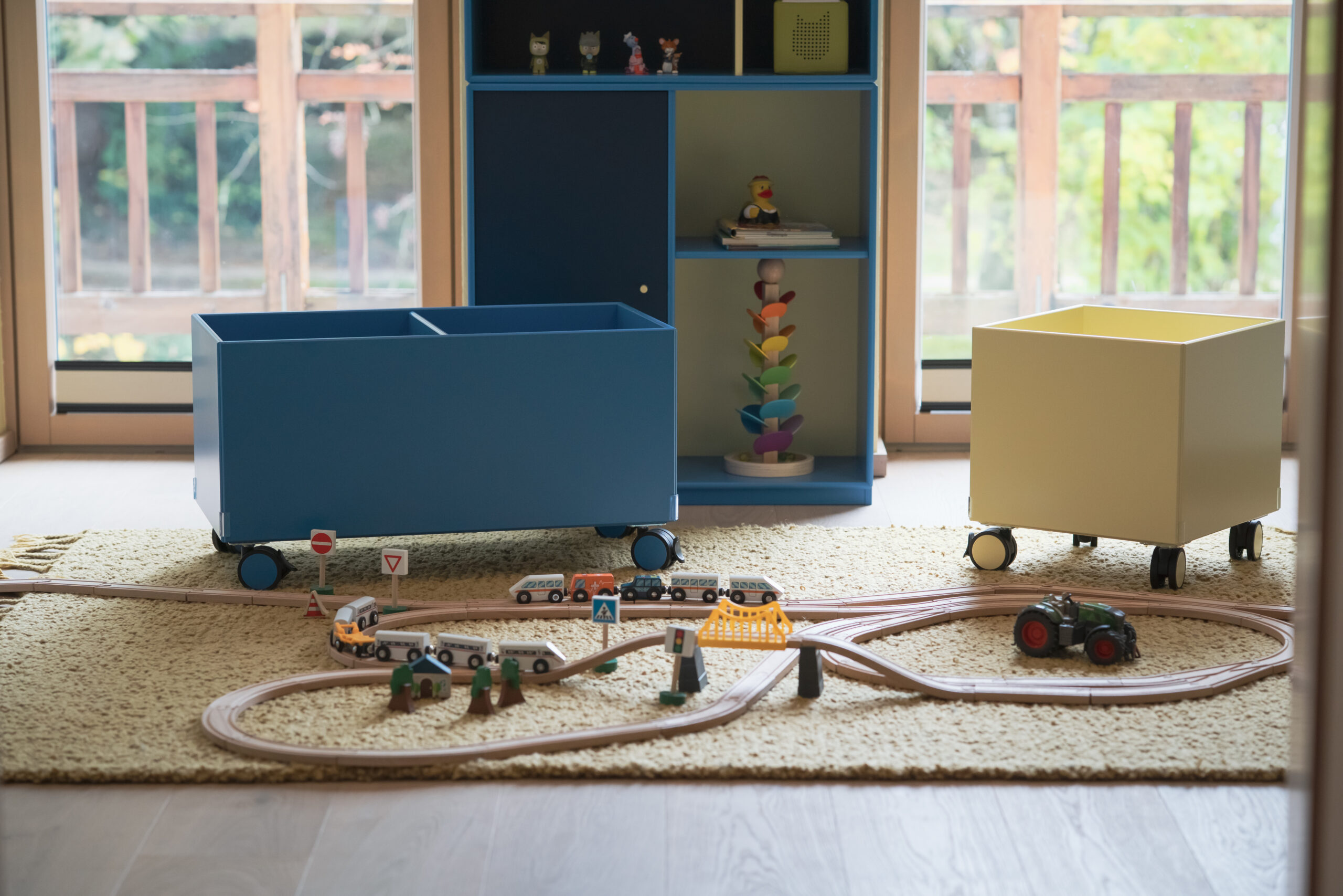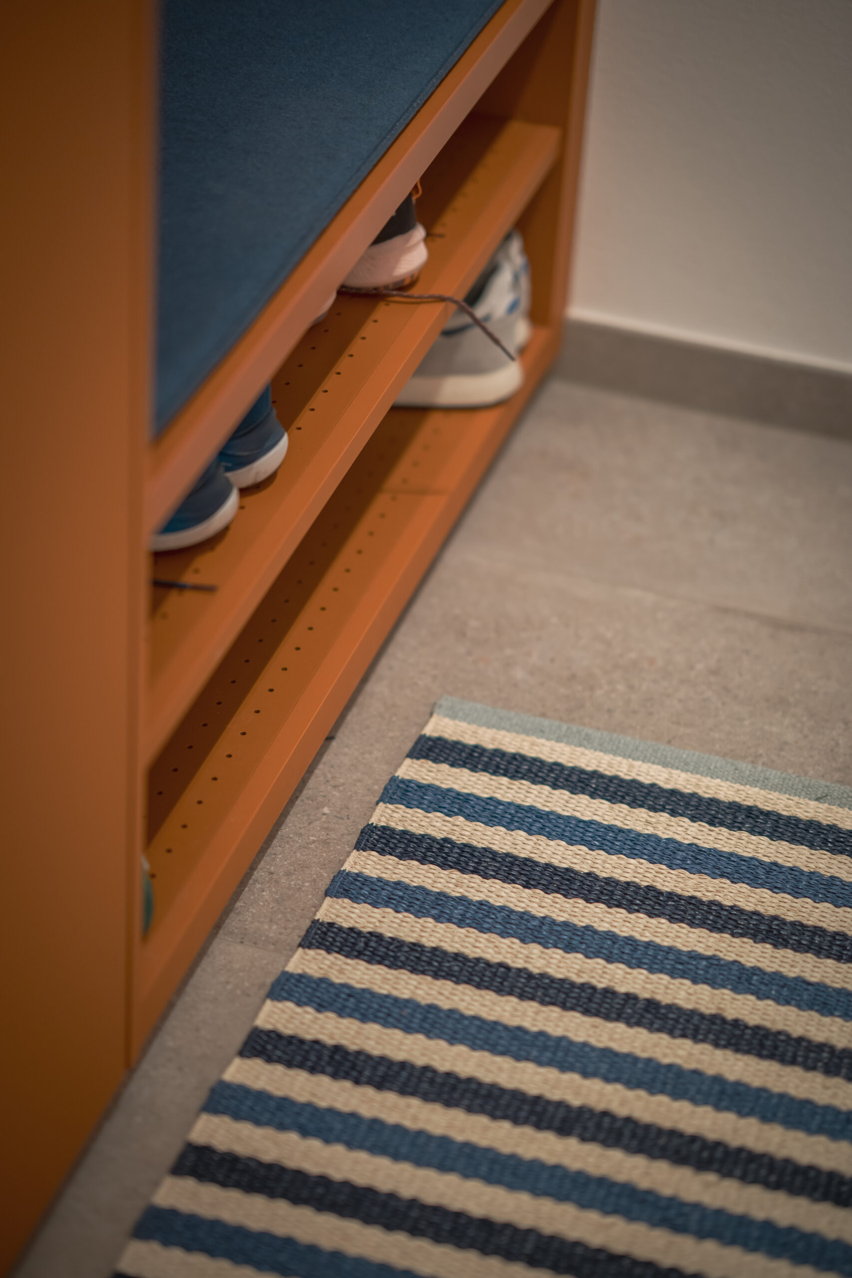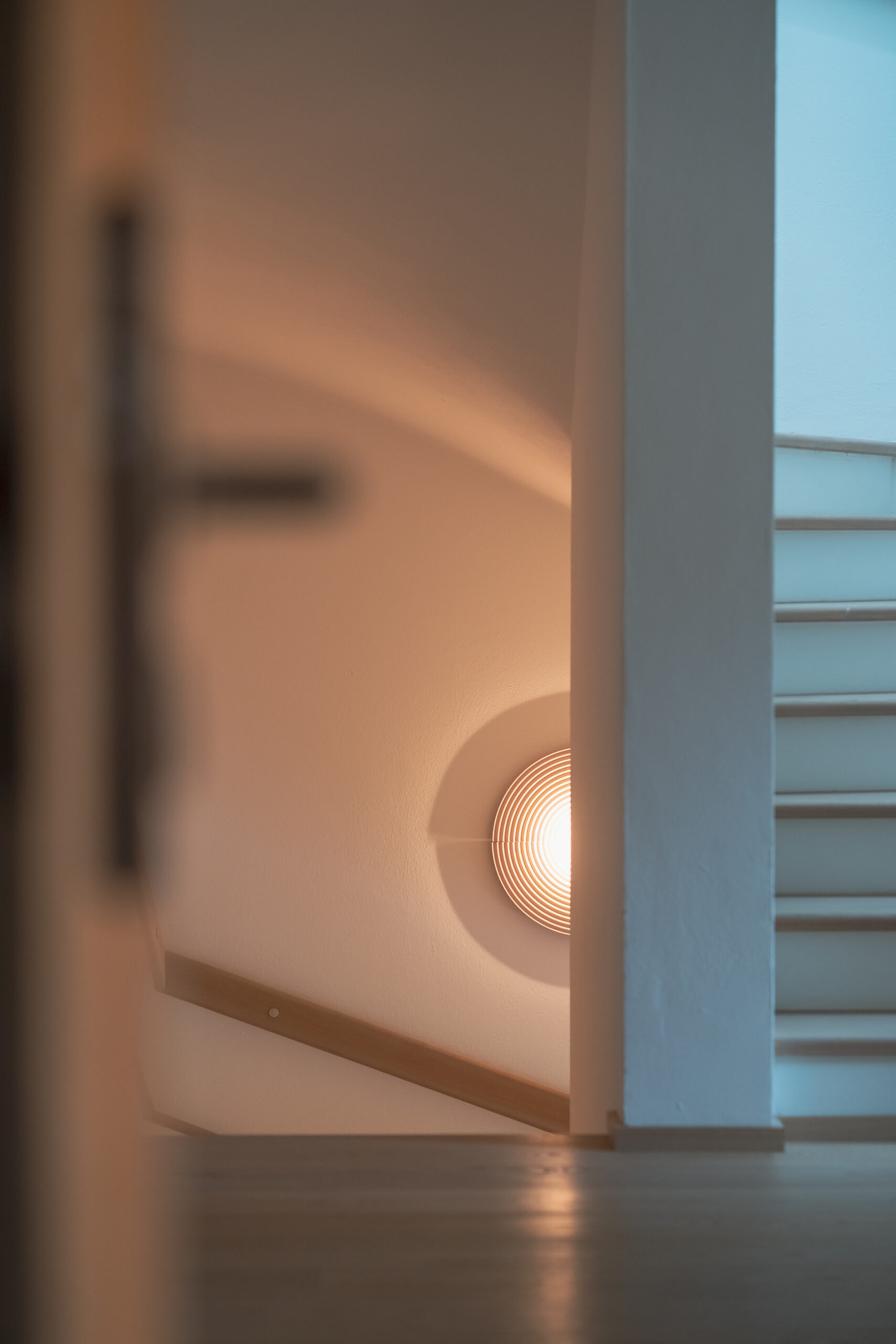 Das lichtdurchflutete Stiegenhaus aus heller Eiche führt in die Schlaf- und Kinderzimmer. Dort bringt das Kinderzimmer Farbe und Leichtigkeit ins Haus. Ein maßgeschneidertes Regalsystem von Montana in Blau- und zitronigen Gelbtönen schafft Ordnung und bietet Platz für Bücher, Spiele und besondere Fundstücke. Der Raum bleibt verspielt und dennoch strukturiert – ein Ort, der mitwächst.