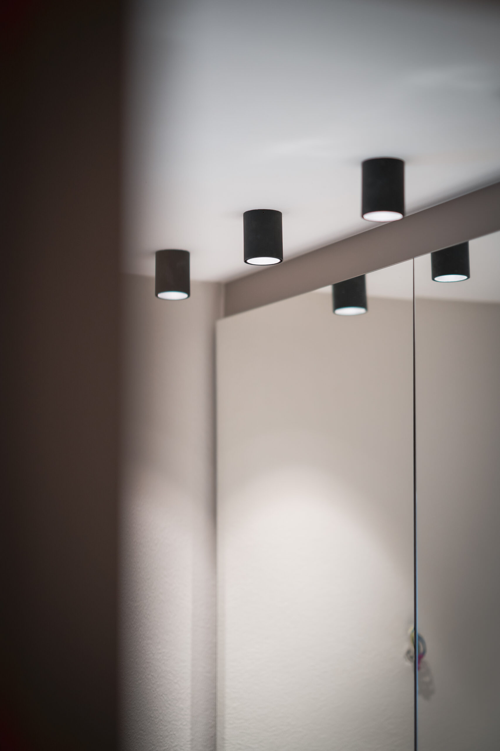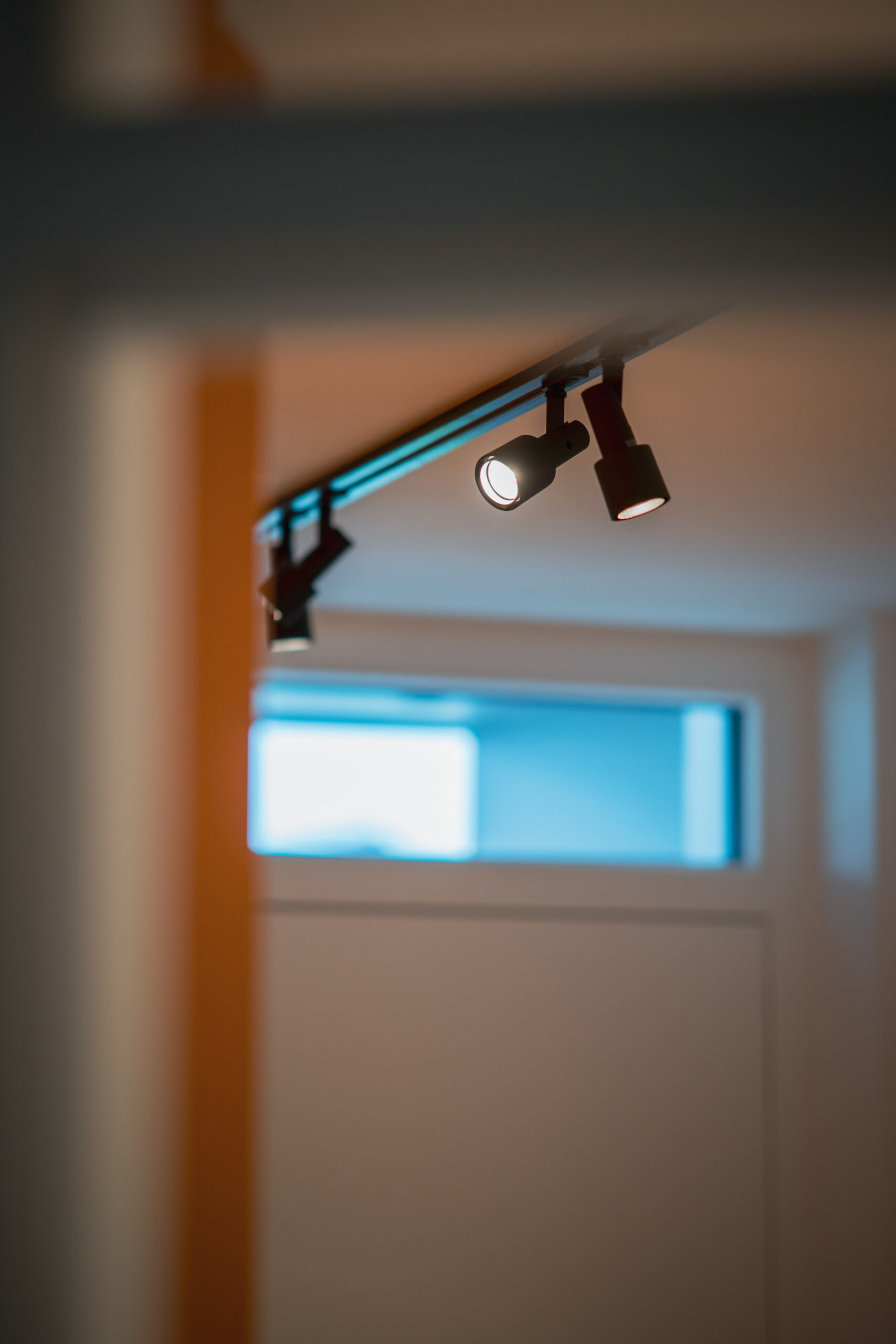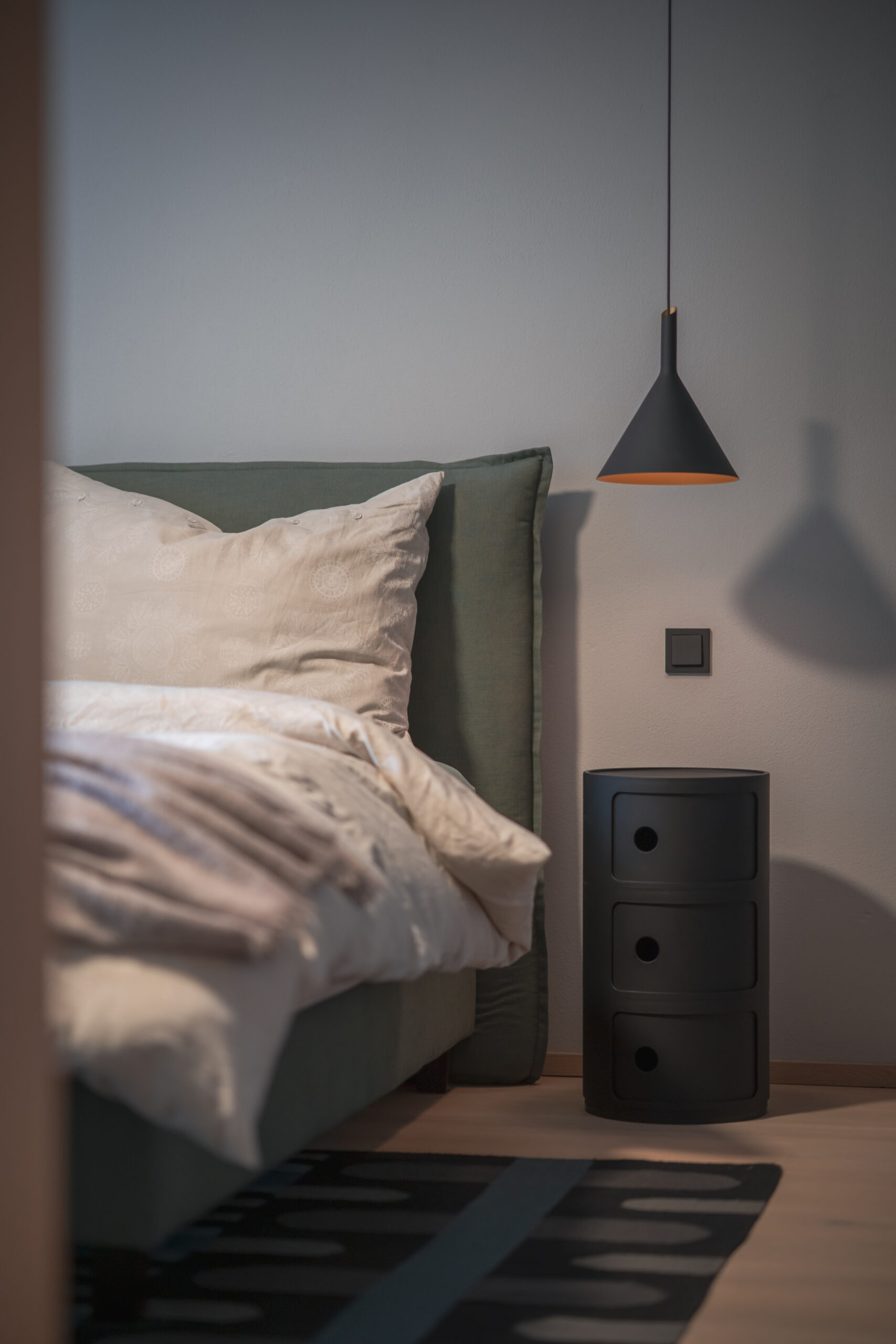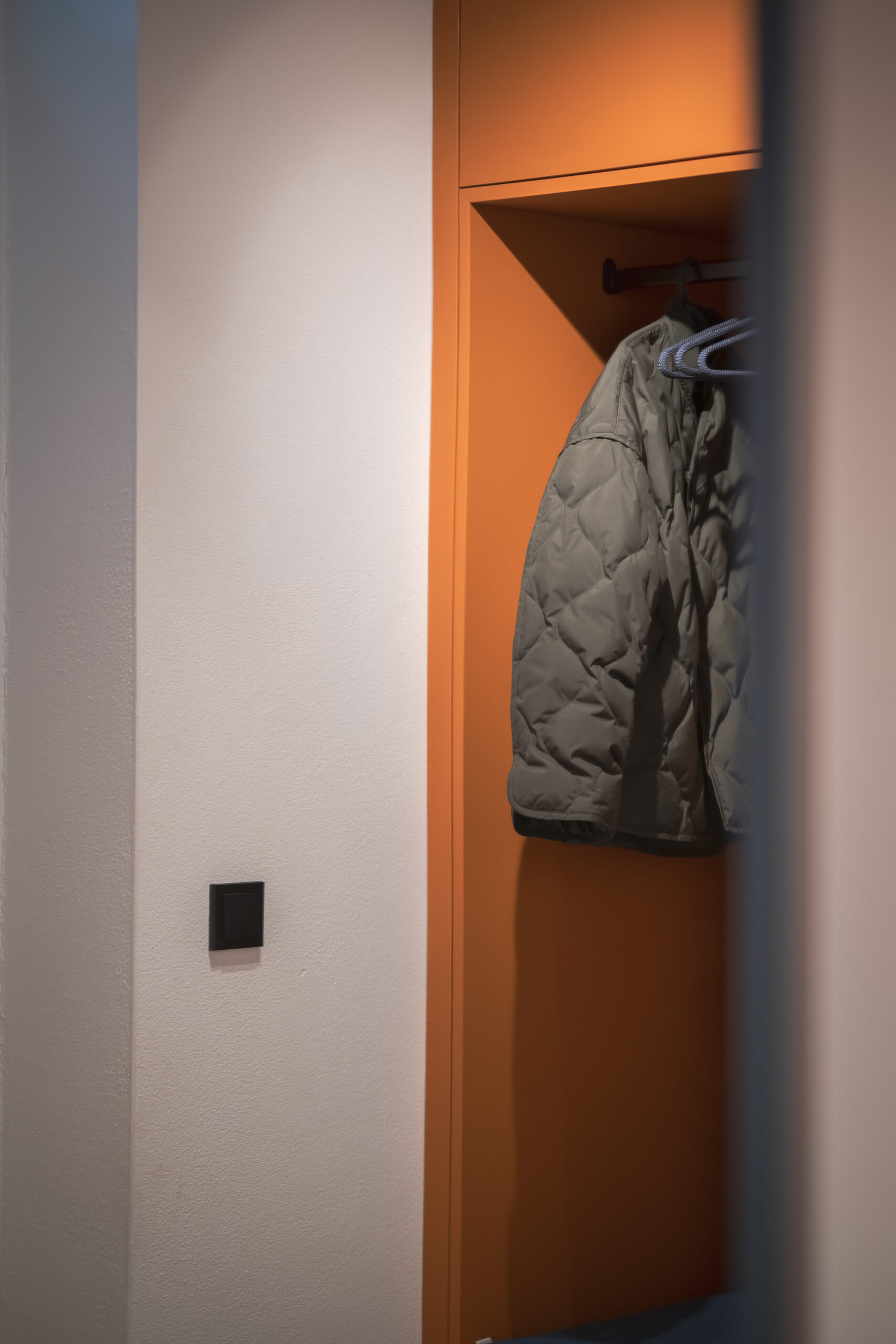 Das lichtdurchflutete Stiegenhaus aus heller Eiche führt in die Schlaf- und Kinderzimmer. Dort bringt das Kinderzimmer Farbe und Leichtigkeit ins Haus. Ein maßgeschneidertes Regalsystem von Montana in Blau- und zitronigen Gelbtönen schafft Ordnung und bietet Platz für Bücher, Spiele und besondere Fundstücke. Der Raum bleibt verspielt und dennoch strukturiert – ein Ort, der mitwächst.