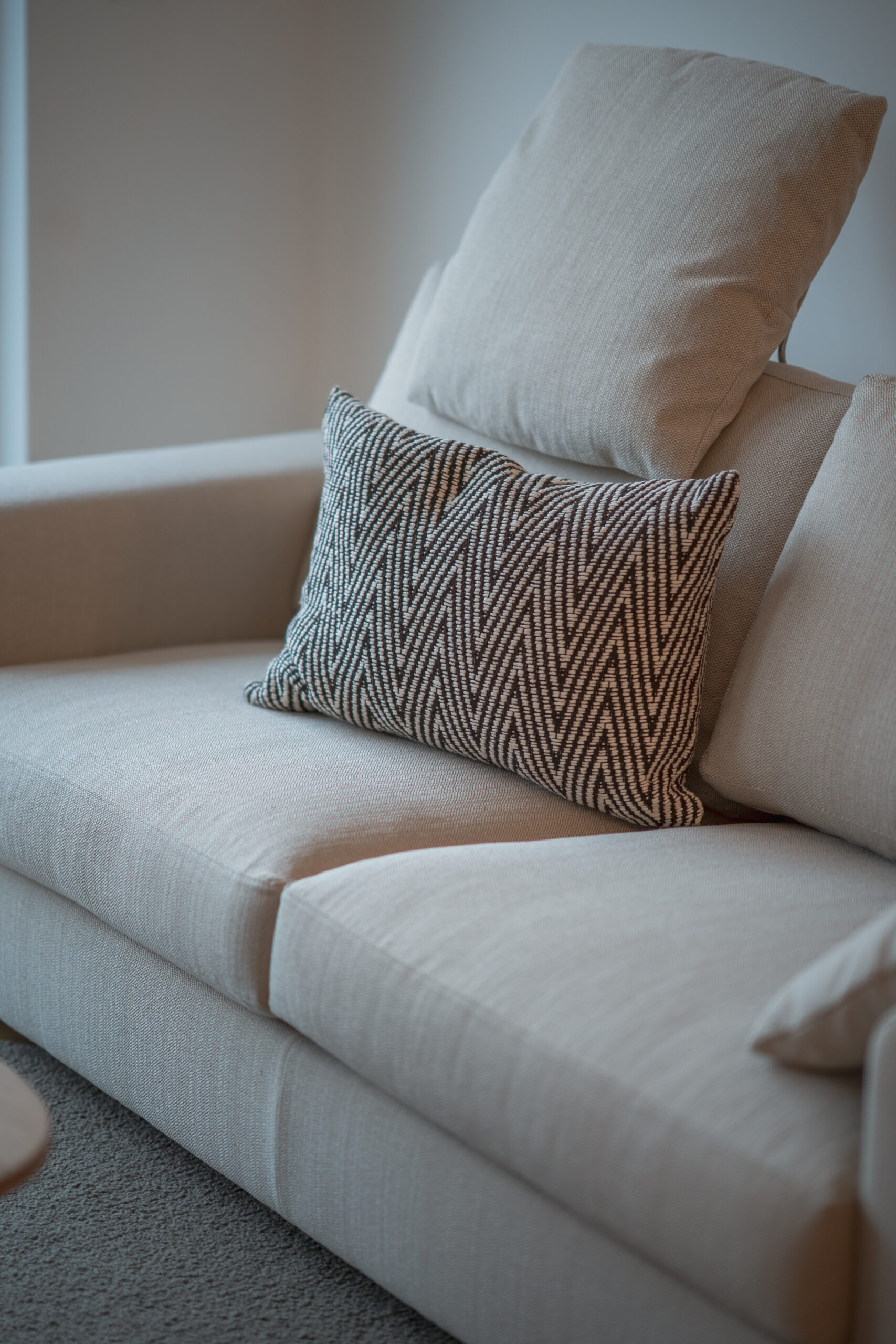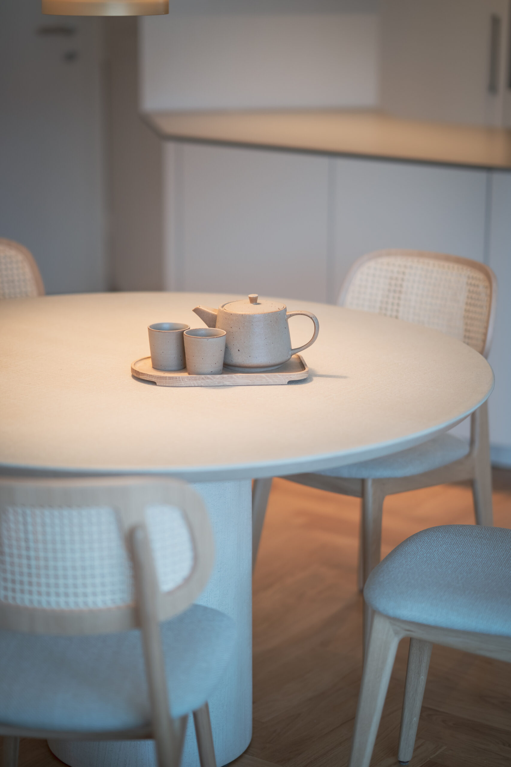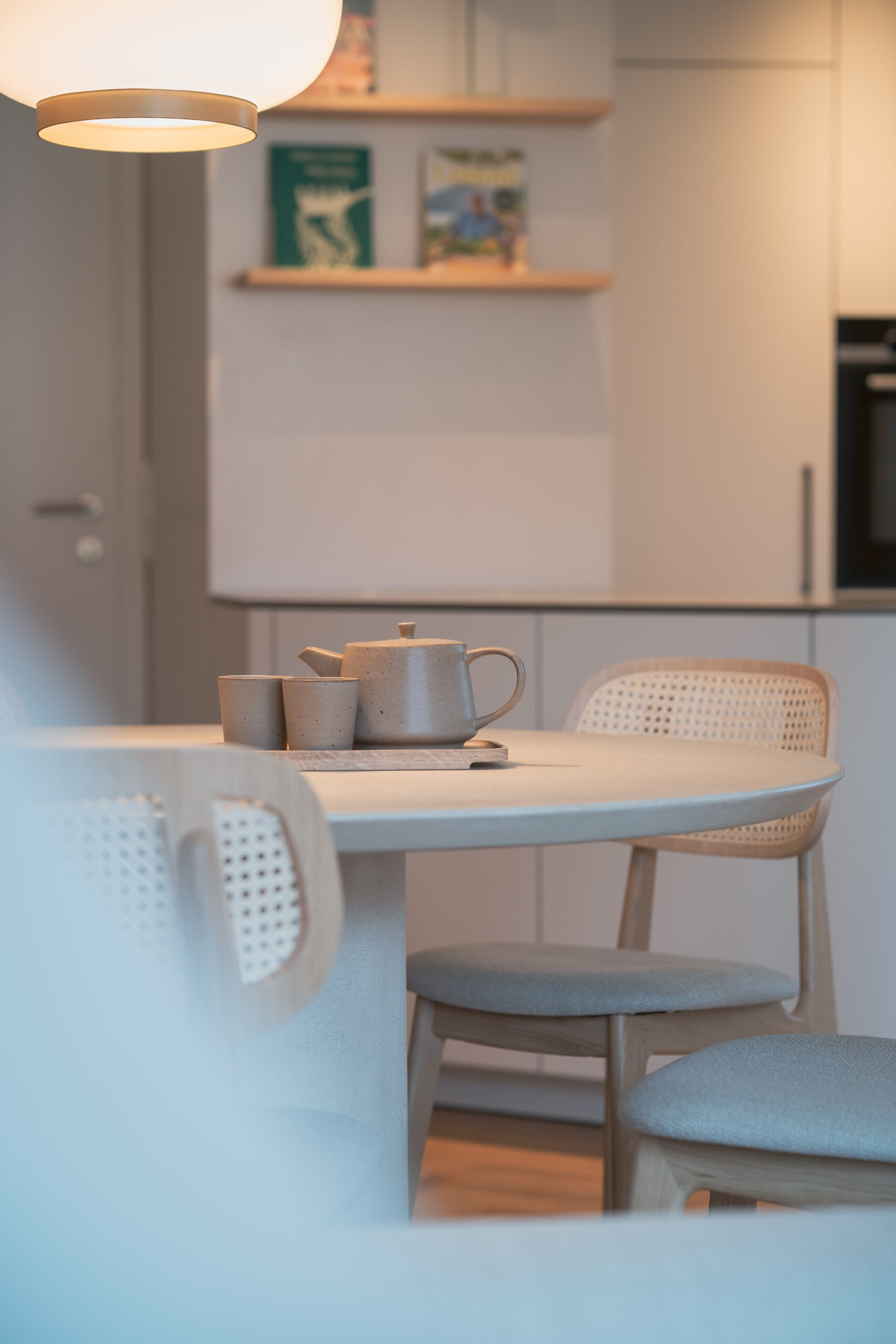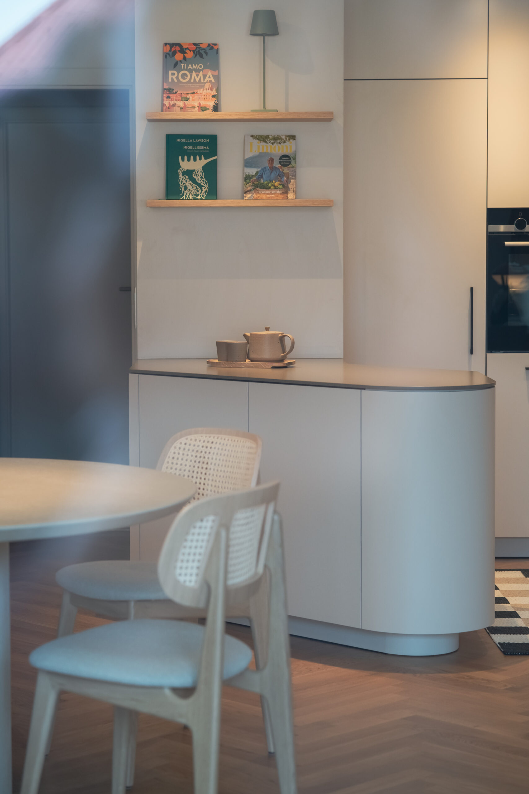 Der Wohn- und Essbereich geht fließend in die Küche über, wodurch Großzügigkeit und eine angenehme Wohnatmosphäre entstehen. Helle, maßgefertigte Einbauten in der Küche sorgen für eine weiche Linienführung und ausreichend Stauraum, während dezente Farbakzente und natürliche Materialien Wärme und Behaglichkeit vermitteln.